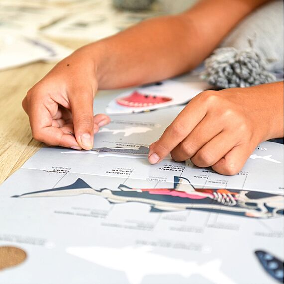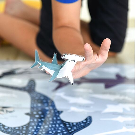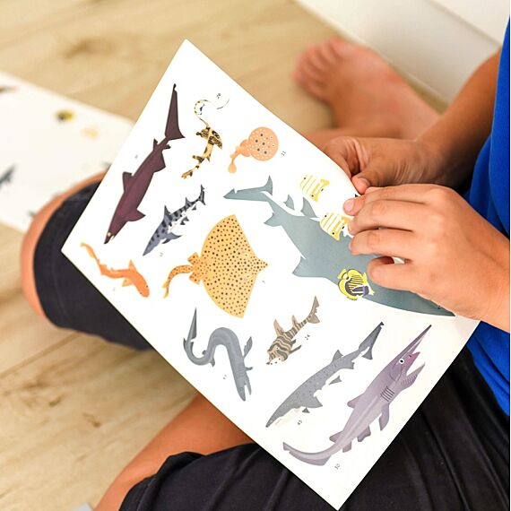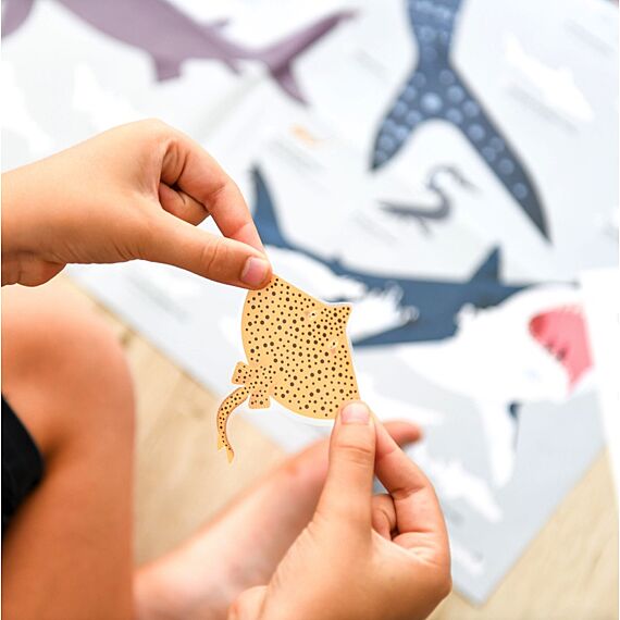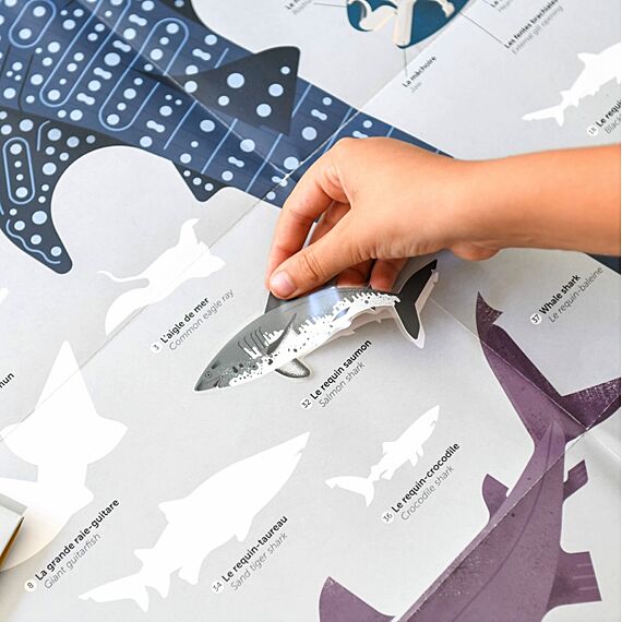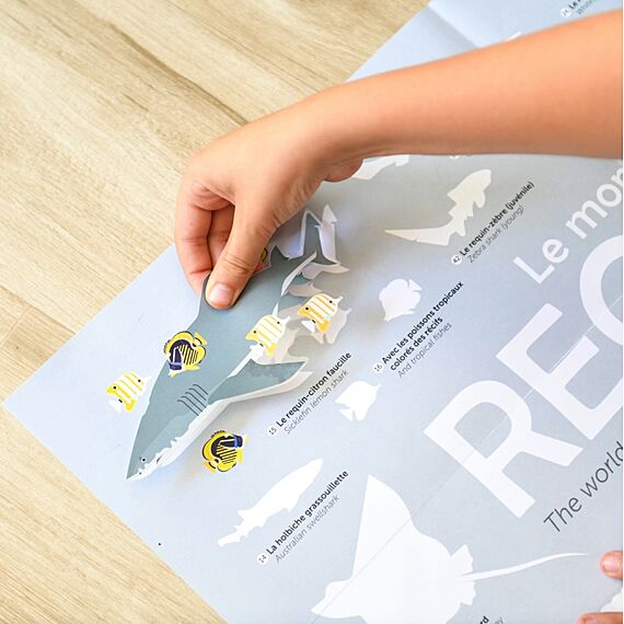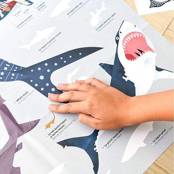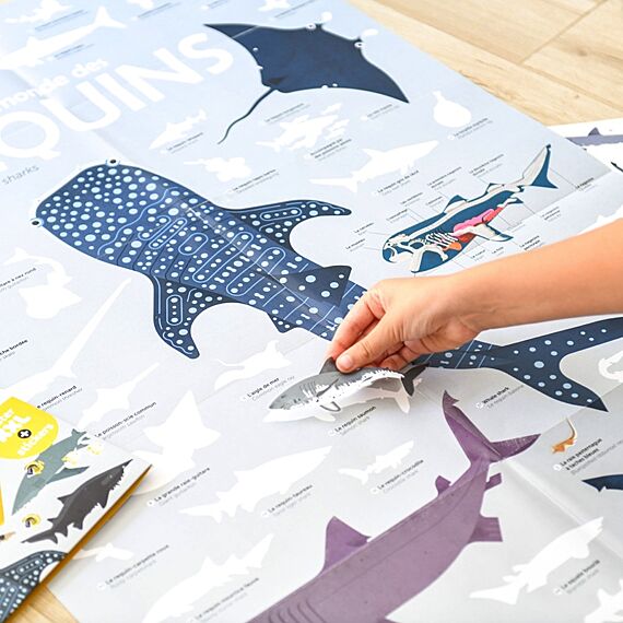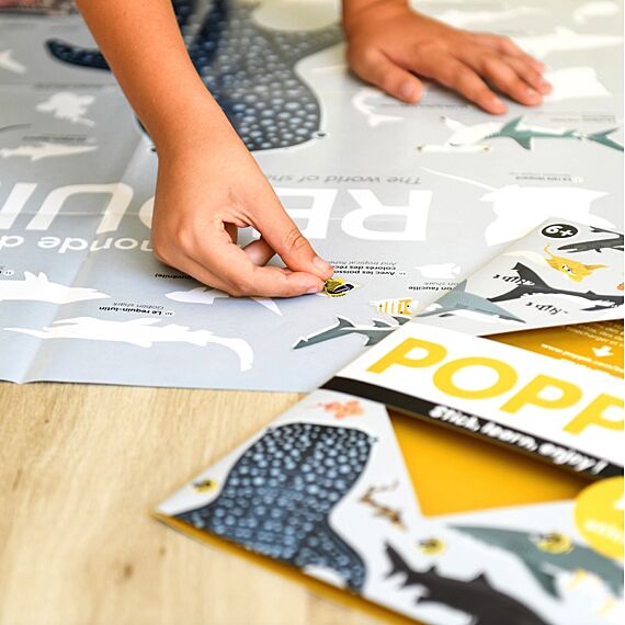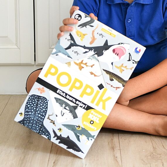 Le poster « Requins » de la marque française Poppik vous fait découvrir le monde fascinant des requins mythiques. La pochette contient un grand poster à décorer avec 45 stickers repositionnables représentant différentes espèces de requins. Ce kit créatif émerveillera les enfants et leur fera découvrir les animaux marins de la famille des requins. En collant les stickers sur le poster, ils découvriront les espèces sous-marines les plus célèbres : le grand requin blanc, le requin-baleine, la raie manta… À l’issue de ce grand poster XXL, ils pourront créer eux-mêmes une magnifique affiche et l’exposer dans leur chambre.