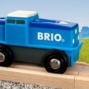 Avec son design bleu et blanc élégant, ce train de marchandises peut tracter les charges les plus lourdes. Un aimant à l'arrière permet de connecter facilement tous vos wagons Brio World. Ces derniers sont vendus séparément chez In den Olifant.