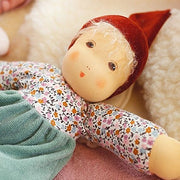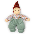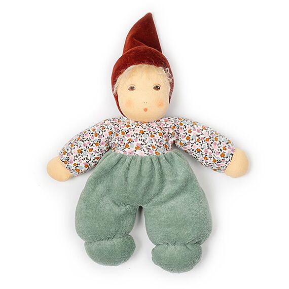 La douce poupée Waldkind Salbei-Braun de la collection allemande Nanchen Natuur est fabriquée à la main avec des matériaux naturels, confectionnée avec soin et sans substances nocives. La poupée Salie, de la collection Waldkind, porte un pantalon en velours vert sauge et un chemisier à imprimé floral délicat dans des tons naturels mêlés de sauge et de rose tendre. Son visage peint à la main, aux yeux bruns, est encadré de cheveux blonds en mohair, et elle porte un long chapeau pointu en velours brun chaud.