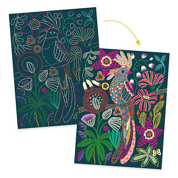 Ce jeu de cartes à gratter Rococo contient quatre magnifiques cartes à gratter aux accents néon et un stylet en bois . Pour découvrir les images, passez le stylet sur le dessin et grattez la couche supérieure. Peu à peu, comme par magie, les dessins se révèlent un à un, et vous aurez l'impression d'être au cœur d'une forêt tropicale luxuriante.