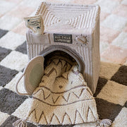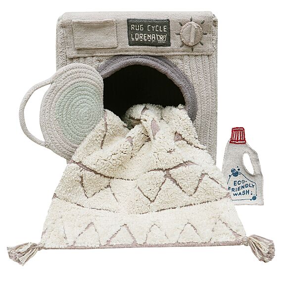 Le panier de jeu Machine à laver de Lorena Canals est à la fois un panier de rangement et un jouet textile, en forme de machine à laver avec une porte battante, un vrai bouton rotatif et un distributeur de savon doux pour des jeux de rôle réalistes et amusants.