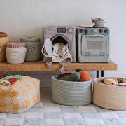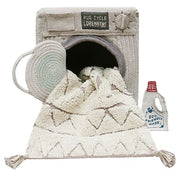 Envie de faire la lessive ? Ce coffret comprend une machine à laver miniature, un mini tapis RugCycled® et une petite bouteille de lessive en toile remplie, idéale pour des jeux symboliques. Chaque pièce est entièrement fabriquée à la main avec un souci du détail exceptionnel, ce qui rend chaque jouet unique. Elle est composée de cordes en coton tressé mélangées à des fibres issues de bouteilles PET recyclées et de toile de coton, et est disponible en gris perle, naturel et bleu.