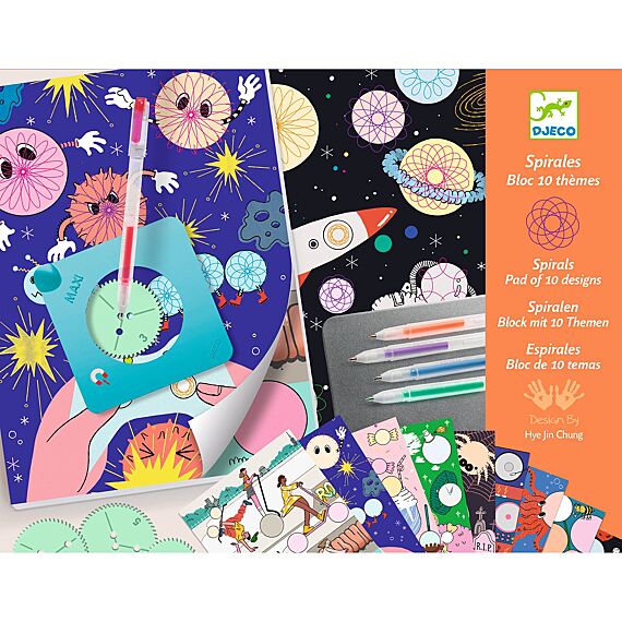 Le bloc Spirales 10 thèmes de Djeco est un ensemble de dessin tout-en-un pour créer de belles spirales colorées qui complètent les images de ce bloc de dessin de 30 pages avec des dessins répartis en 10 thèmes différents.