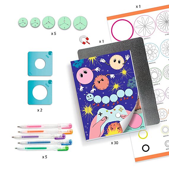 Un classique revisité par Djeco grâce à des outils ingénieux qui permettent de créer des spirales sans glisser ! L’enfant place la feuille sur la plaque métallique, puis fixe le cadre magnétique dans lequel s’insère l’engrenage. À l’aide du stylo, il trace des cercles pour créer facilement une rosette sans avoir à maintenir le cadre en place.
