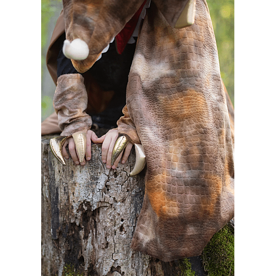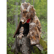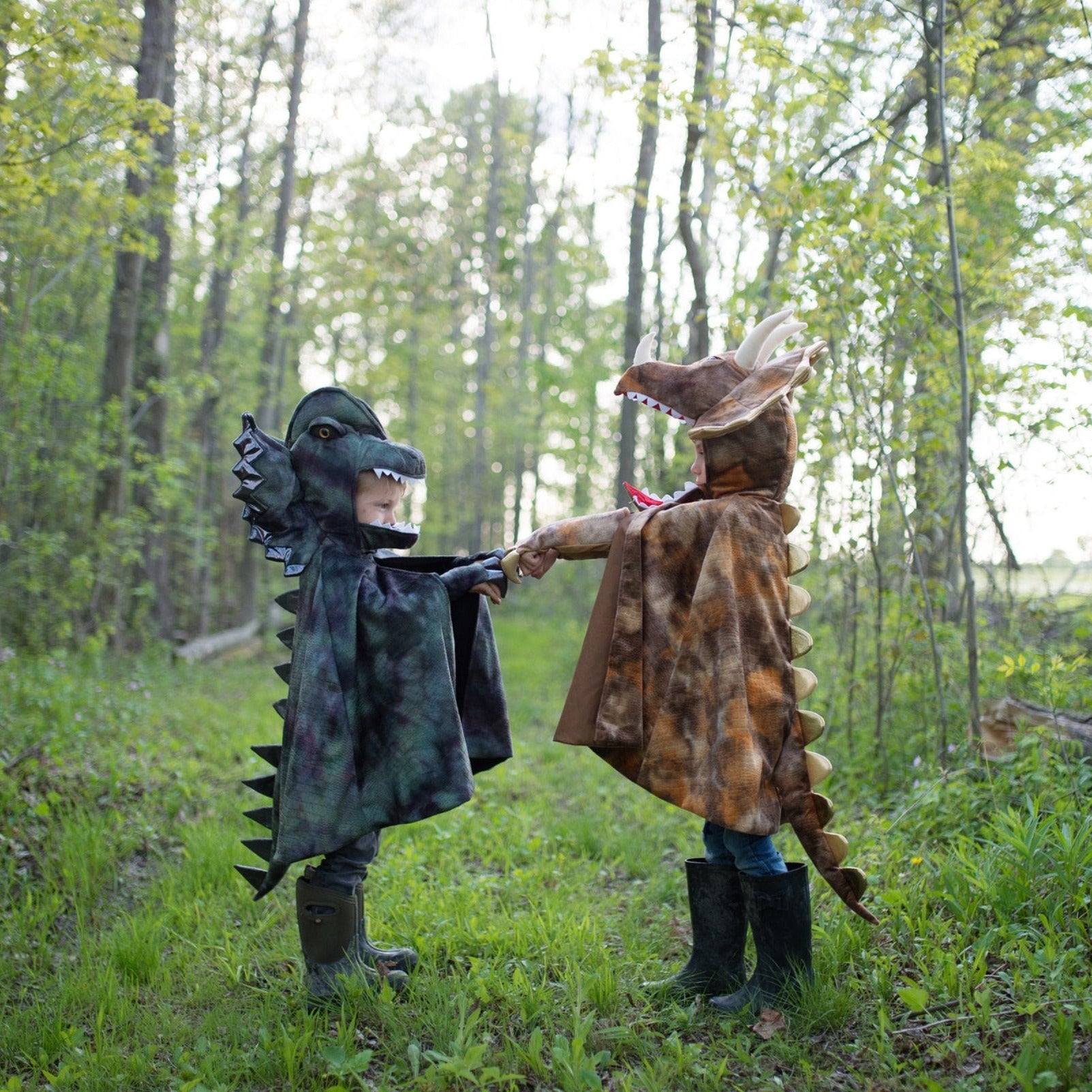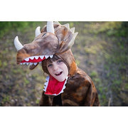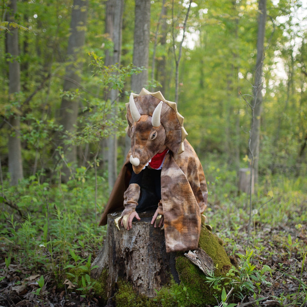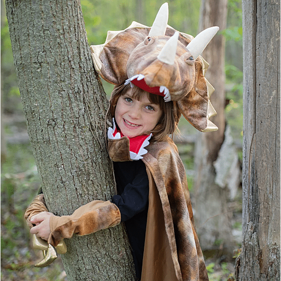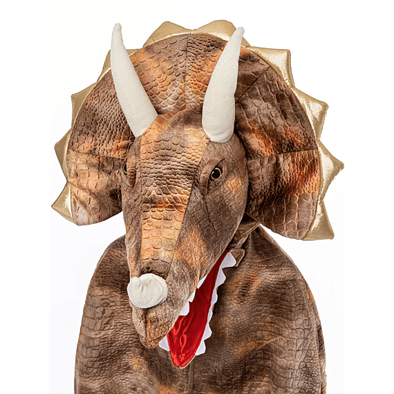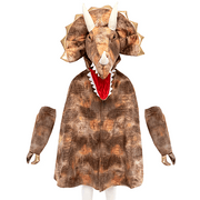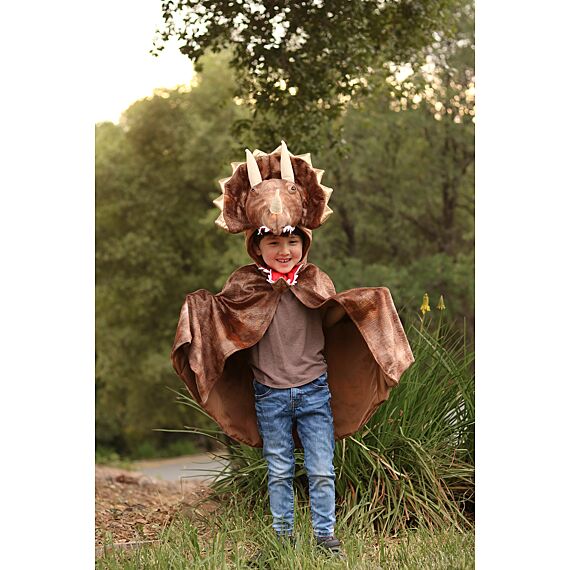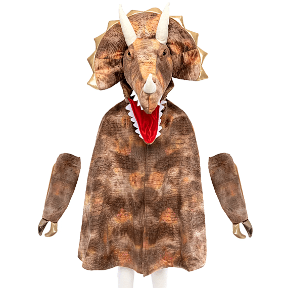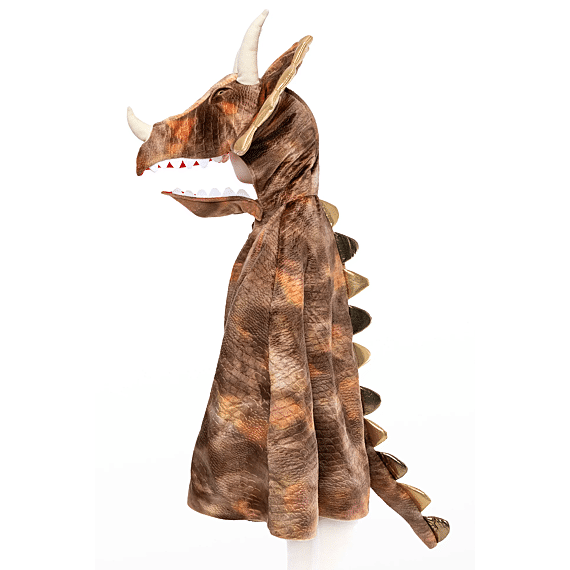 La cape de déguisement Grandasaurus Triceratops de la collection Great Pretenders est le cadeau idéal pour les petits passionnés de dinosaures. Votre enfant adorera cette cape de dinosaure super mignonne et monstrueuse ! Peinte à la main dans des tons de marron, gris et orange, elle est doublée de rouge et de marron. Des pointes métalliques dorées et marron sont appliquées dans le dos. La tête de dinosaure est munie d'une gueule amovible pour un maintien optimal. Cet ensemble deux pièces comprend la cape et les griffes.