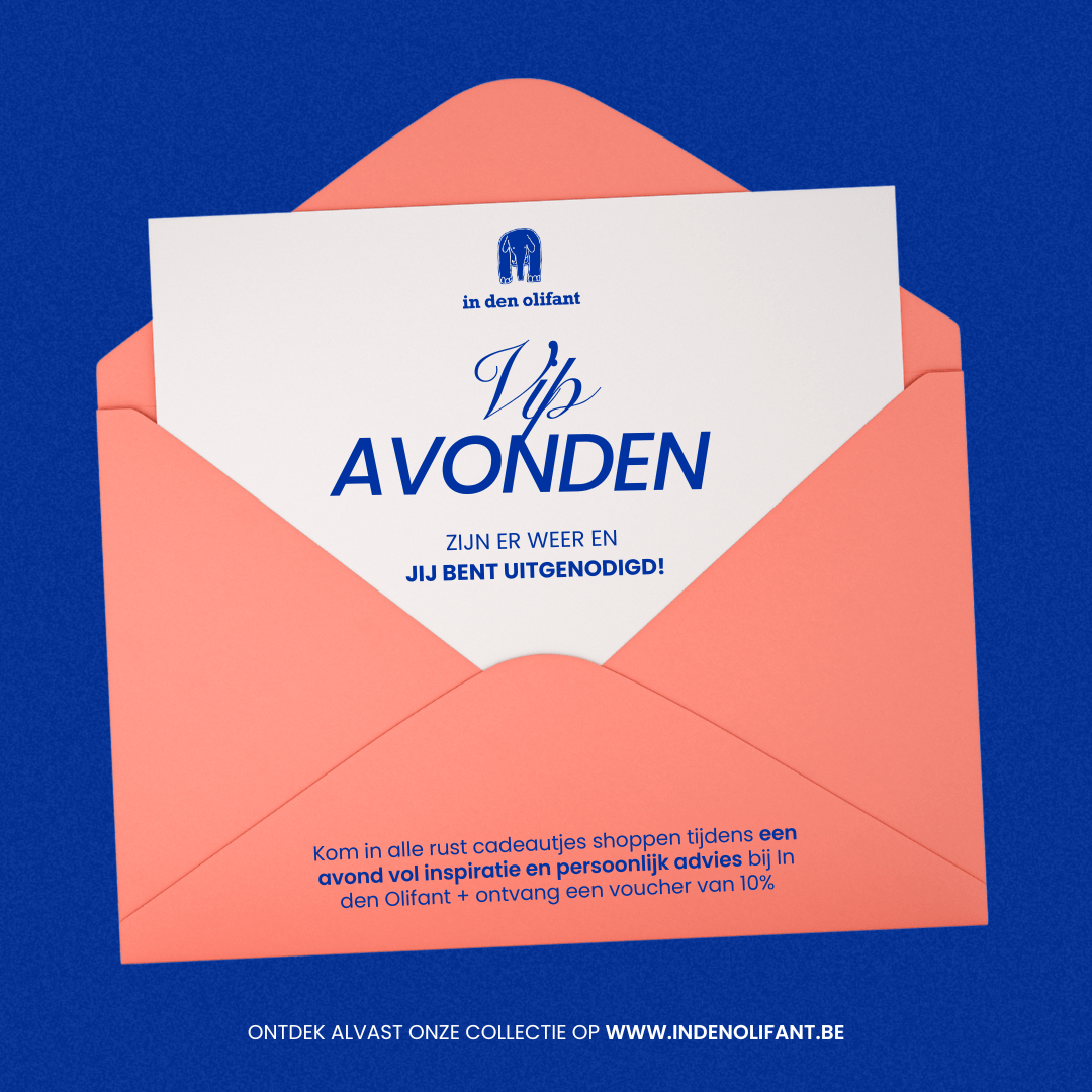 Onze VIP-avonden zijn er weer en jij bent uitgenodigd! Omdat we geloven dat cadeautjes kiezen niet gehaast moet gaan, maar met tijd, persoonlijk advies en dat tikkeltje In den Olifant-verwondering nodigen we je graag uit voor onze In den Olifant VIP-avonden in aanloop van de Sint en Kerst periode. We verheugen ons erop je te ontvangen, je te helpen kiezen en samen een warme start te maken van de mooiste tijd van het jaar. Reserveer je plaats en kies de avond die het best bij je past: