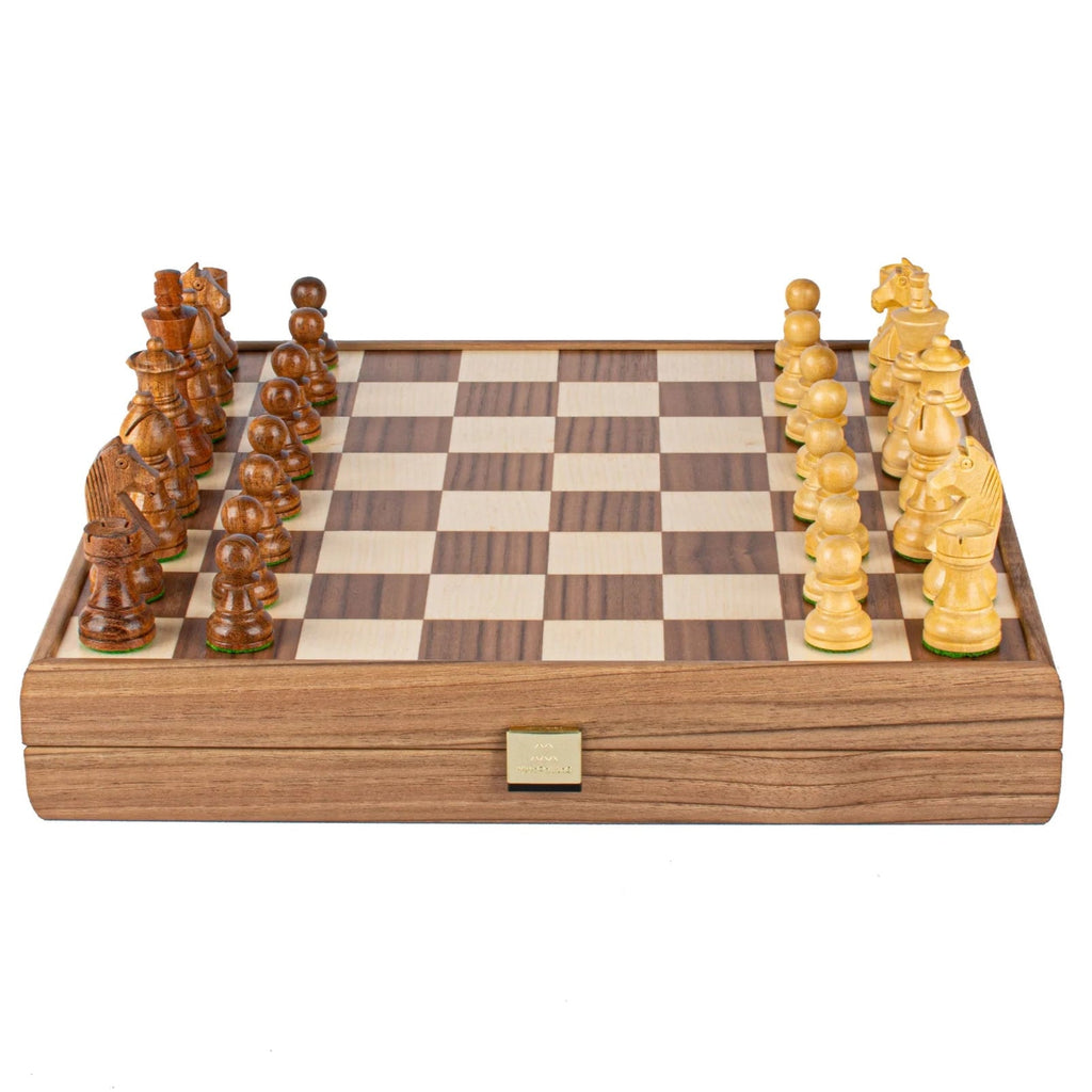 Le jeu d'échecs Manopoulos en bois, avec ses pièces Staunton et son échiquier en noyer incrusté dans un coffret en bois, est conçu pour les passionnés d'échecs qui apprécient le savoir-faire, la qualité et l'élégance classique. L'échiquier de 35 x 35 cm est réalisé en noyer et chêne massif et présente des cases de jeu de 4 x 4 cm parfaitement finies. Sa surface lisse garantit un jeu fluide et agréable.