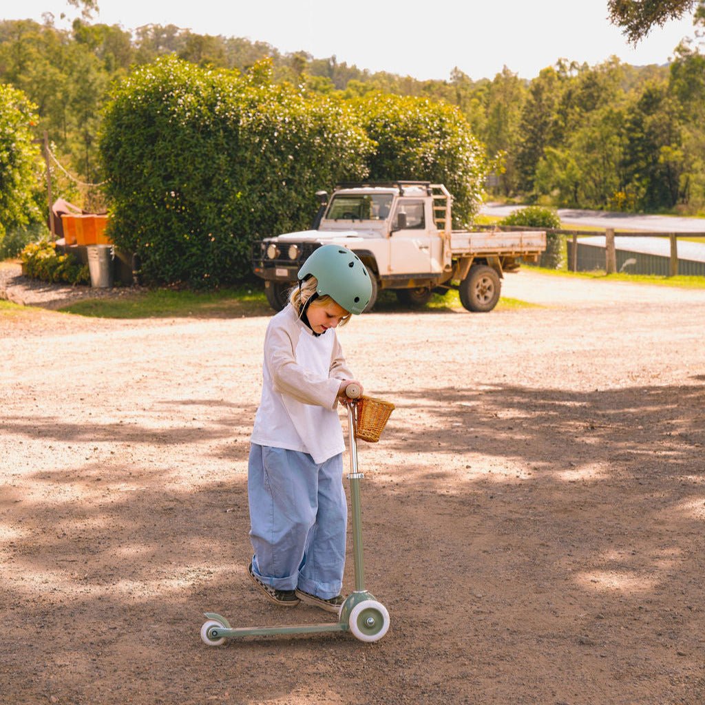 Het verstelbare T-stuur groeit in drie hoogtes met je mini mee, en het brede eikenhouten deck met antislip grip zorgt voor stabiliteit bij elke stap. En ja, ook hier mag het klassieke rotan mandje niet ontbreken: want een ritje wordt pas écht leuk met een knuffel of koekje voor onderweg.
