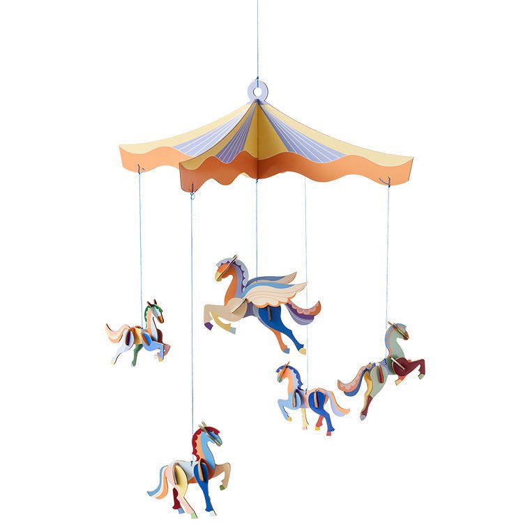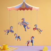 Kleur en magie komen samen in elk design van Studio Roof: de Circus of the Sun Mobile is een geweldig creatief, kleurrijk én origineel cadeau voor jong en oud. Laat sierlijke vliegende paardjes dansen samen boven het wiegje, in je kamer of aan het plafond van de speelhoek. Deze fantastische mobiel heeft een speels design dat fantasie en rust brengt in elk interieur.