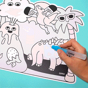 Deze onderlegger in dino thema reageert op water. Schilder met de meegeleverde magische waterpen over de placemat en als bij toverslag verschijnen de kleuren. De set droogt in slechts een paar minuten en de kleuren verdwijnen. Als het droog is, beginnen we opnieuw, eindeloos leuk en gegarandeerd verwondering aan tafel met je kleintje.