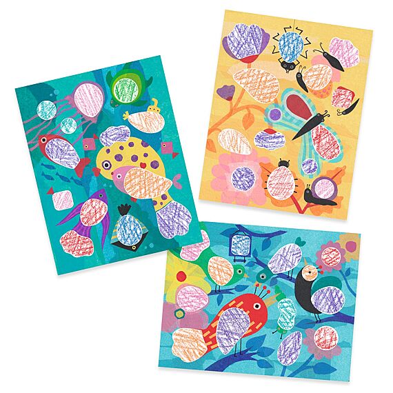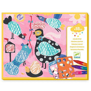 Birdie & Co is een eerste kleurdoos uit de collectie van het Franse Djeco, geschikt voor kinderen vanaf 18 maanden. Met de hulp van een volwassene legt het kind eerst een blad in het deksel van de doos en vervolgens de sjabloon.