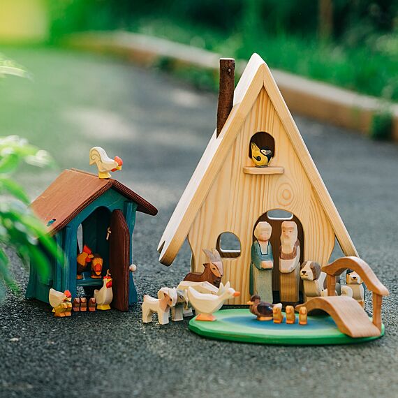 Elk figuurtje wordt met de hand gemaakt in Duitsland, met hout uit duurzame binnenlandse bosbouw. Elk houten diertje uit de Ostheimer collectie is een uniek stuk dat met veel liefde en de nodige zorg is gemaakt. De kleuren zijn op waterbasis zijn licht transparant om de houtnerf te benadrukken, de speelfiguurtjes worden niet afgewerkt met vernis om de schoonheid van het hout zichtbaar te houden. De ongelakte beeldjes zijn geolied met plantaardige olie uit biologische landbouw.