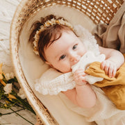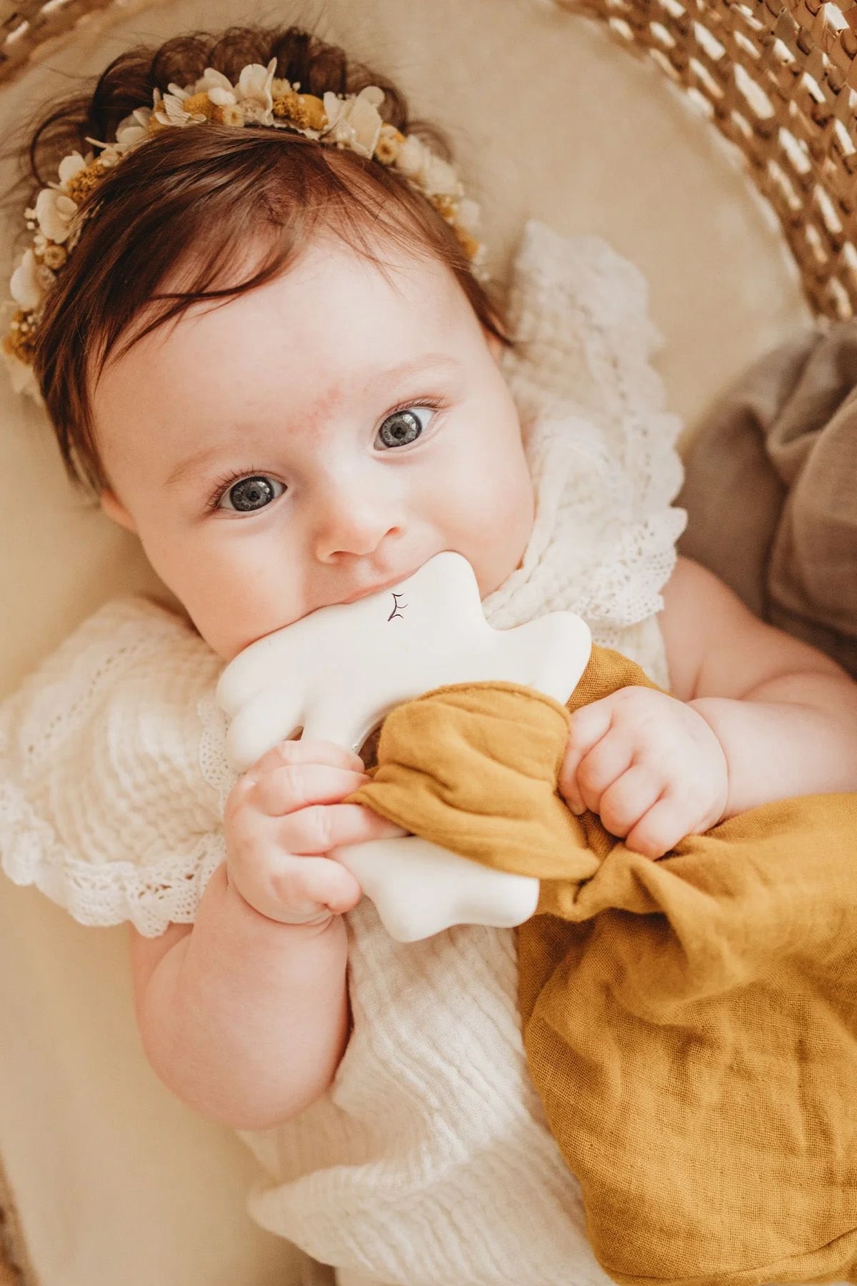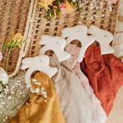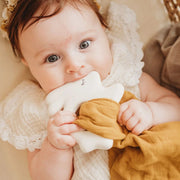 Deze bijtring van Kikadu in de vorm van een konijntje is gemaakt van natuurlijk rubber en afgewerkt met een mousseline doekje in okergeel. Een zalige combinatie die helpt bij doorkomende tandjes en het knuffeldoekje helpt je kindje om sneller in slaap te vallen.
