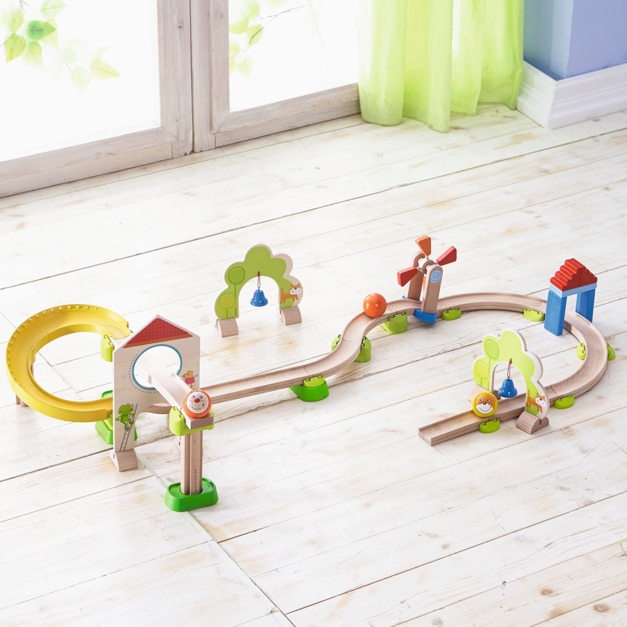 De Kullerbü Knikkerbaan Windmolenbaan van Haba is een uitdagende knikkerbaan met snelle afdalingen en leuke effecten. De grote houten knikkers rolt van de baan door het poortje en versnelt via de steile spiraal. Dan volgt de molen, die de grote knikker verder laat gaan over de hobbels. Tot slot rolt de knikker door de rinkelende belletjespoort, waar de klassieke baan eindigt. Maar daar stopt het avontuur nog niet! Want ook deze knikkerbaan is makkelijk om te bouwen naar een zelfverzonnen variant, alsmede uit te breiden met één van de Rollebollen Knikkerbanen.