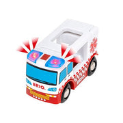 • Materiaal: gemaakt van FSC-gecertificeerd beukenhout en hoogwaardig kunststof, de locomotief werkt op batterijen, de lichtjes van de ambulance kunnen echt branden