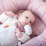 De zachte activiteitenknuffel Activity Toy Rabbit van Kikadu is het ideale eerste knuffeltje voor baby’s die hun zintuigen willen ontdekken. Gemaakt van GOTS-gecertificeerd biologisch katoen, vrij van schadelijke stoffen en ontworpen met oog voor detail én duurzaamheid. Dit slaperig konijntjes-knuffel biedt verschillende structuren, labels, knisperdelen en zachte kleuren die baby’s aanmoedigen om te voelen, grijpen en luisteren.