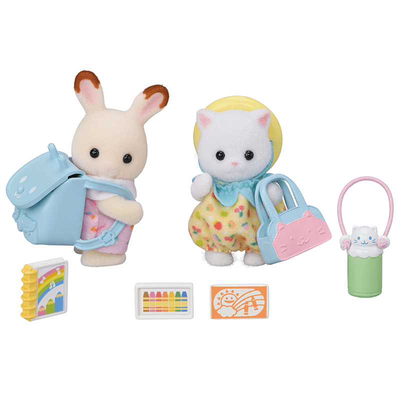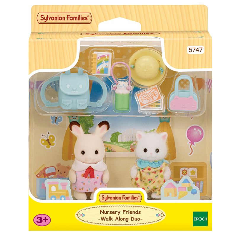 Deze schattige Sylvanian Families set Nursey Friends Walk Along Duo bevat twee schattige babies - een konijn en een kat - met tal van accessoires zoals een rugzak, hoed en waterfles, alles wat de baby nodig heeft voor de wandeling naar de kinderkamer. De baby's kunnen de rugzak, draagtas, waterfles en hoed dragen en vasthouden. De accessoires kunnen ook voor elke andere Sylvanian-baby worden gebruikt.