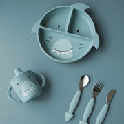 Deze lekvrije peuterbeker met haaienmotief matcht perfect met het bijpassende siliconen bordje en kindvriendelijk bestek van Trixie, zodat je een vrolijke en herkenbare tafelset kunt samenstellen – ideaal voor de eerste zelfstandige eetmomenten van je kleintje. Shop de volledige tafelcollectie hier >