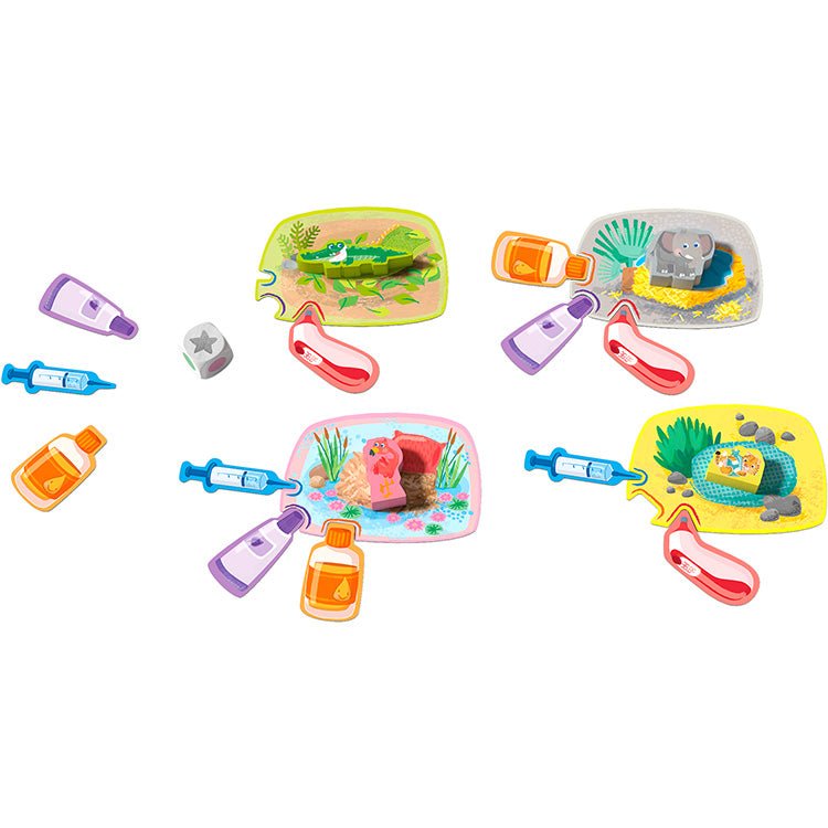 Het is druk bij de dierendokter! De krokodil heeft kiespijn, het jachtluipaard heeft buikpijn, de olifant is verkouden en de flamingo heeft een gebroken been. Kunnen jullie een handje helpen? In de dokterstas vind je alle benodigdheden om de dieren weer beter te maken, zoals een zalfje, een spuitje en een thermometer. Elk dier heeft een net iets andere behandeling nodig, dus het is belangrijk dat ze de juiste benodigdheden krijgen. Rol de dobbelsteen en geef het dier met de zelfde kleur een van de benodigdheden. Als een dier alle behandelingen heeft gehad, draai je het dier om en ziet het er weer gezond en vrolijk uit.
